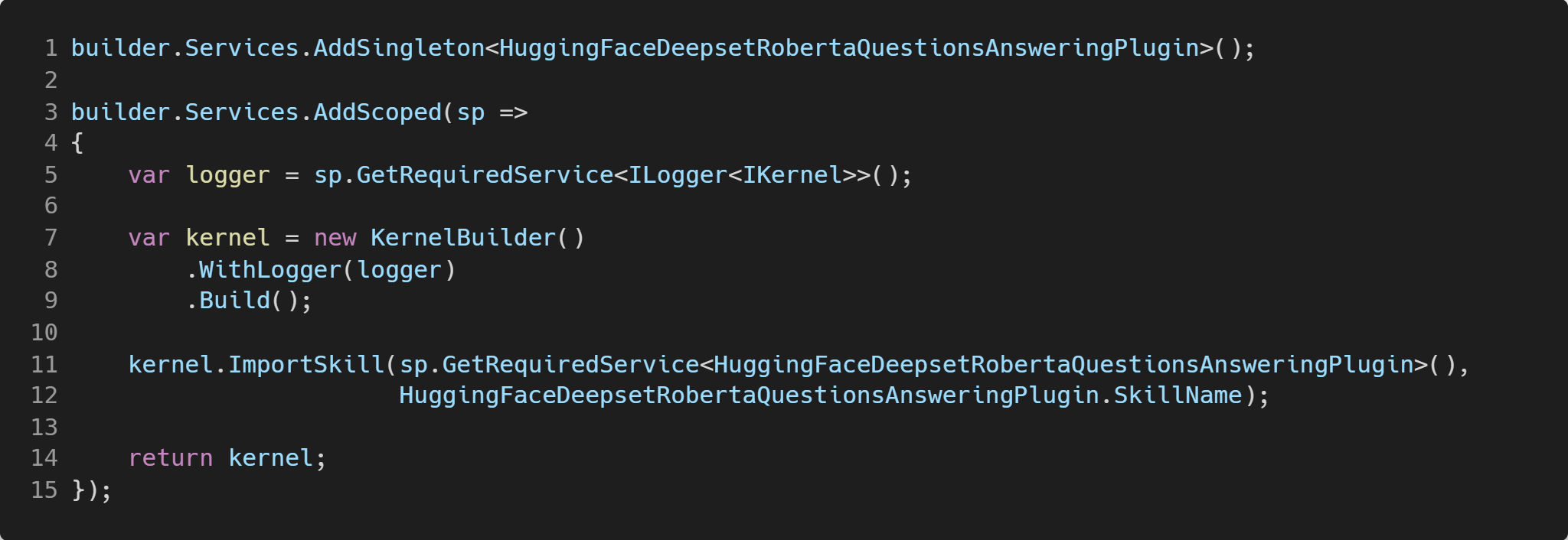 Dentro de la configuración, una vez que tenemos un kernel establecido, importamos la Función Nativa (líneas 11 y 12) proporcionando una instancia de ésta y un nombre para la skill que representa.