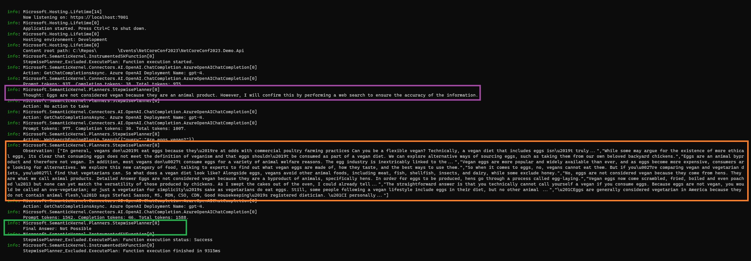Ahora, este código de por si no nos dice mucho sin el ejemplo del objetivo que pedimos en su momento. Lo que haremos es pedirle que cree una receta vegana empleando huevos, los cuales obviamente no pueden ser empleados en este tipo de comidas al ser un producto de origen animal. Lo que va a ocurrir es que el planificador entrará en duda de cómo poder cumplir con el objetivo del usuario, por lo cual buscará a través de Bing confirmar si los huevos son utilizables en recetas veganas o no, y al determinar que no lo son, retorna un “No es Posible” como resultado. Esto lo puedes ver en las trazas de la ejecución: